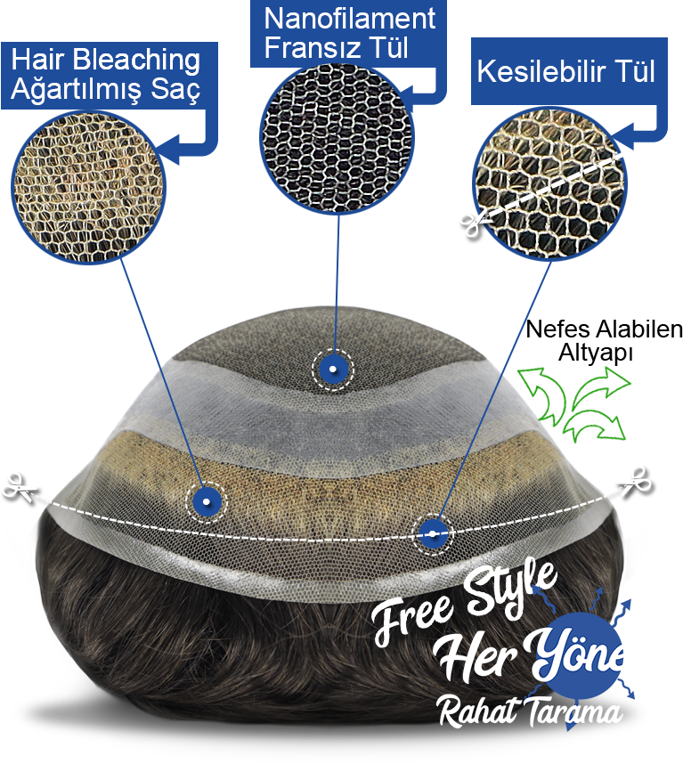 Ön bölgede kullanılan ince yapılı, tamamen şeffaf nanofilament tül, saç çizgisindeki belirginliği minimum seviyeye indirerek doğal bir saç çıkışı görünümü oluşturur.