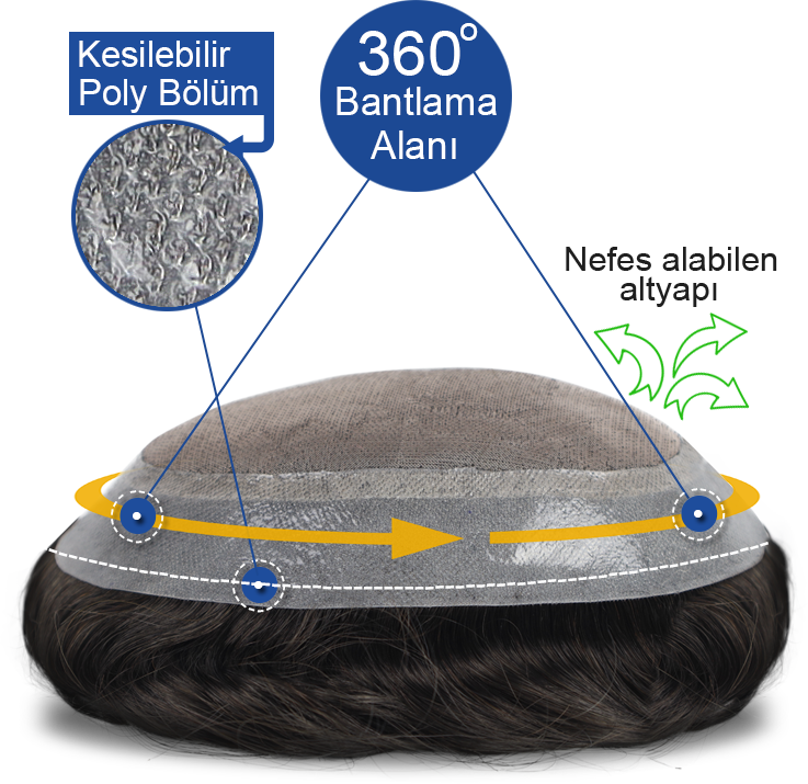 Çevresinde bulunan 360 derece P.U bantlama alanı, protez saçın her açıdan güçlü tutuş sağlamasına yardımcı olur ve güvenli bir kullanım sunar. Ön bölümde yer alan poly taban, kullanıcının ölçülerine göre kesilebilir yapısıyla kişiye özel uyum sağlar ve uygulama kolaylığı sunar.