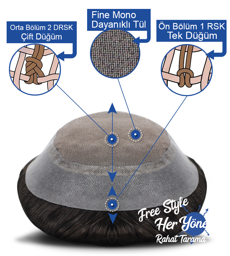 Ön kısımda yer alan 1 cm’lik alan RSK tek düğüm tekniği ile işlenmiştir. Bu yapı sayesinde saç dipleri ve düğüm noktaları son derece doğal görünür, alın hattında %100 doğal bir saç çıkışı etkisi elde edilir. Modelin geri kalan bölümlerinde ise DRSK çift düğüm kullanılarak sağlamlık ve uzun ömürlü kullanım desteklenmiştir.