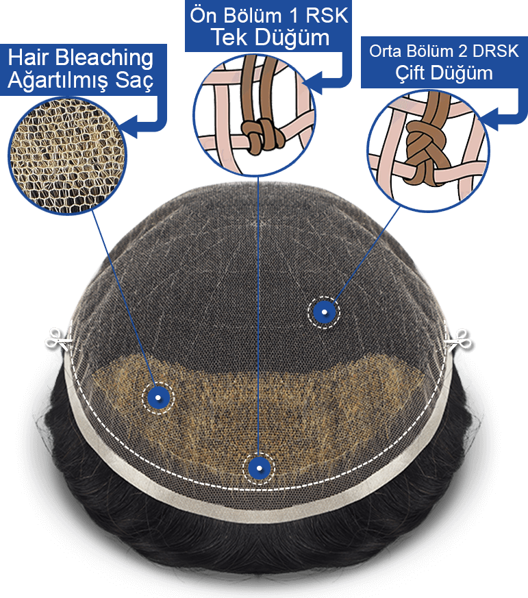 Ön kısımda yer alan 4 cm’lik alana Hair Bleaching (saç ağartma) tekniği uygulanmıştır. Bu işlem sayesinde saç dipleri ve düğüm noktaları cilt rengiyle bütünleşir, alın hattında belirginlik tamamen ortadan kalkar ve %100 doğal bir görünüm elde edilir. Ön bölümde bulunan nanofilament tül, kullanıcının ölçülerine göre hassas şekilde kesilebilir ve kişiye özel uyum sağlar.
