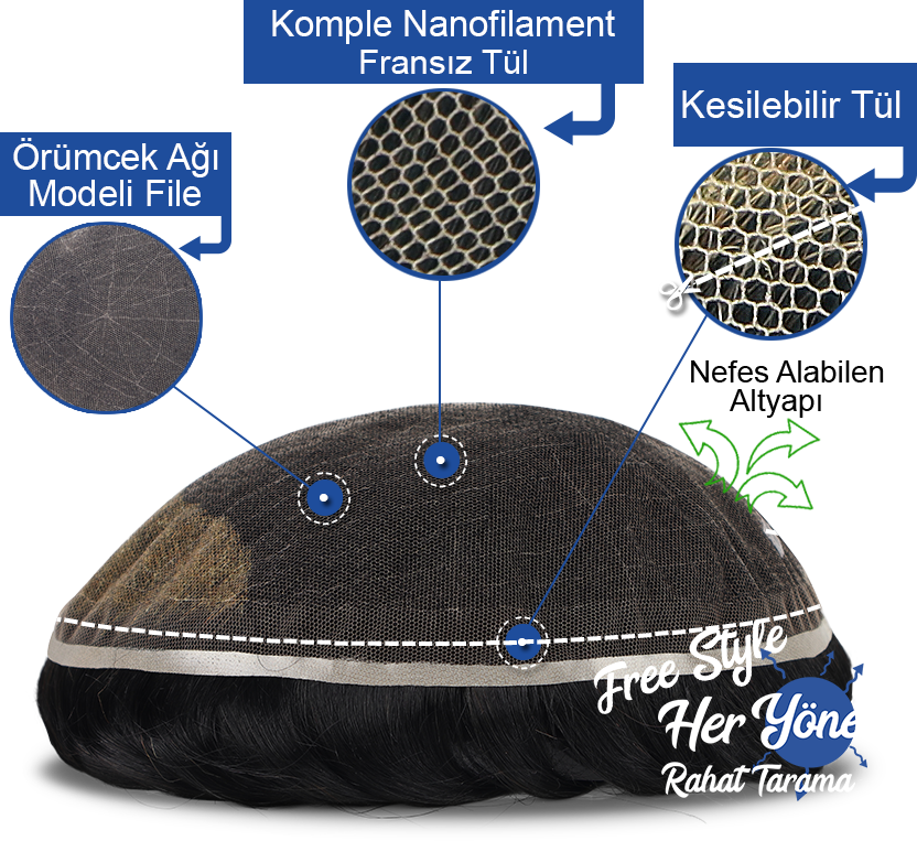 Falugnaft Modeli Protez Saç, %100 gerçek insan saçlarından üretilmiş, üst düzey doğallık ve maksimum nefes alabilirlik sunan özel bir protez saç modelidir. Altyapısının tamamında kullanılan nanofilament tül yapı, %100 hava ve su geçirgenliği sağlayarak saç derisinin gün boyunca rahatça nefes almasına imkân tanır. Bu özellik, saç derisinin oksijen almasını ve suyla temas edebilmesini sağlayarak konforlu ve ferah bir kullanım sunar.