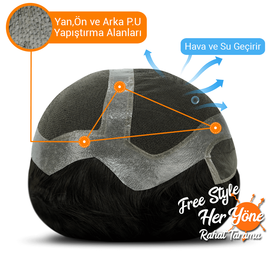 Yapıştırılabilir alanlar haricindeki tüm yüzey komple ince tül yapıdan oluşur. Bu ince ve şeffaf altyapı, doğal saç çıkışı görünümünü destekler ve protez saçın fark edilmesini minimum seviyeye indirir.
