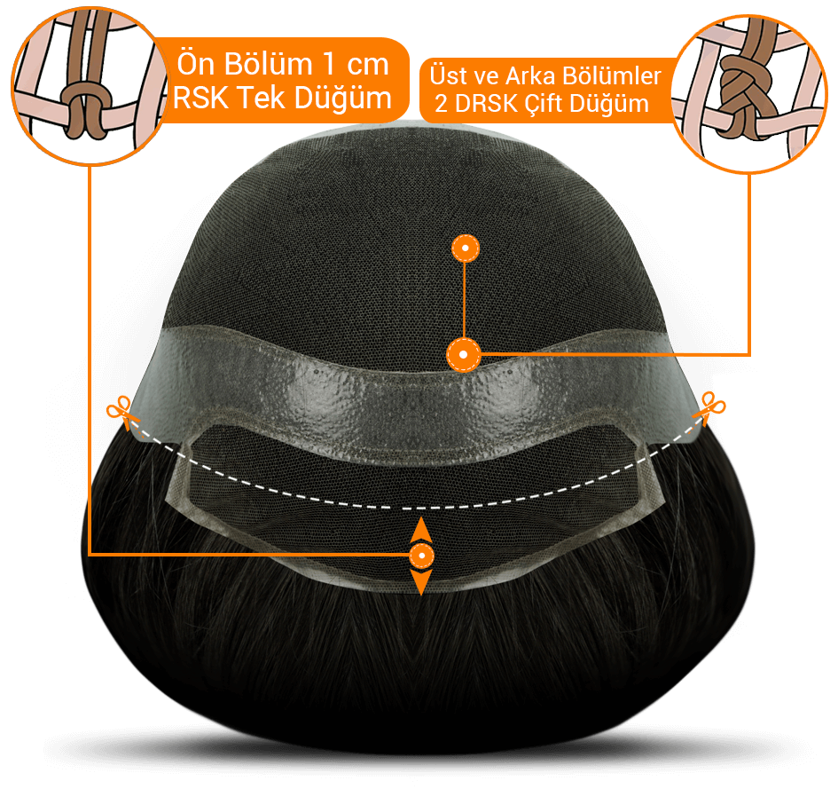 Doğal saç çizgisi görünümünü korumak için ön bölümde 1 cm RSK tek düğüm tekniği uygulanmıştır. Geri kalan tüm alanlarda DRSK çift düğüm kullanılarak dayanıklılık ve uzun ömürlü kullanım sağlanmıştır. Orta bölümlerde yer alan tül altyapı, hava ve su geçirgenliği sunarak saç derisinin gün boyunca nefes almasına imkân tanır. Bu sayede kafa derisi oksijen alır ve suyla temas edebilir; konforlu bir kullanım deneyimi elde edilir.